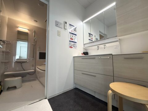 また、こちらの建物には最新のユニットバスを実際に体感できる入浴体験コーナーが設けられています。代表的な「シンラ」シリーズをはじめ、湯の流れや照明、音、香りまで五感で味わえるユニットバスがずらり8空間。製品の快適性や技術力を、体験を通して実感できる特別な空間を社員みんなで味わうことができました。