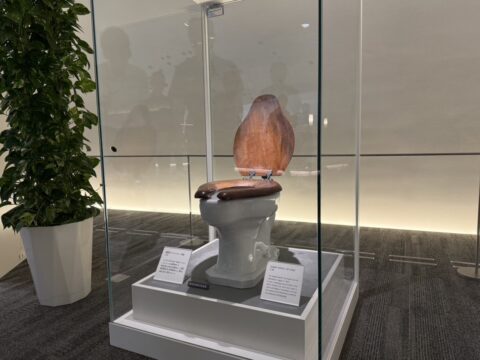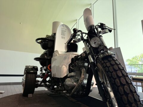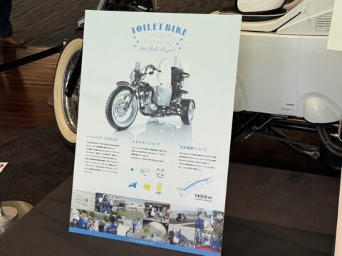 ライダーがまたがる便座型のバイクで、し尿や廃食油をエネルギー源として走行する仕組みを採用。TOTOが提案する“循環型社会”を体現した乗り物として製造されたもののようです。もちろん走行可能!ユーモラスな見た目の中に、未来の環境技術への真剣なメッセージが込められています。
