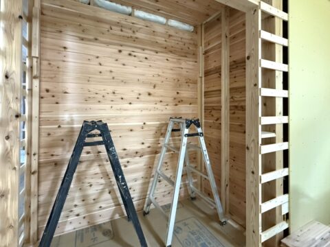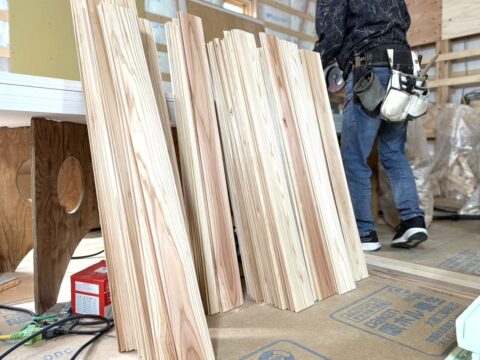 こちらの現場では、玄関~リビング・和室の天井に杉板を施工しており、現場に入るとふわりと木の香りが広がり、空間全体がやわらかな空気で包まれます。