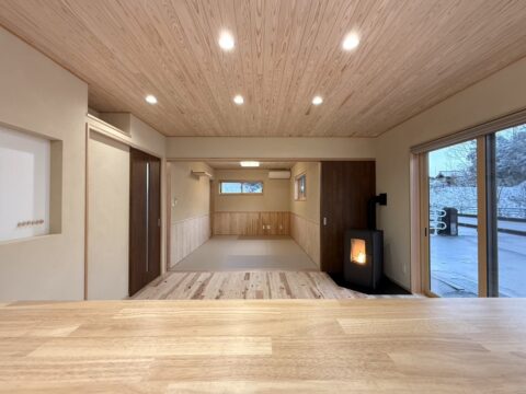 断熱性能の高い樹脂窓&無垢フローリングや珪藻土などの自然素材により保温効果抜群の家。