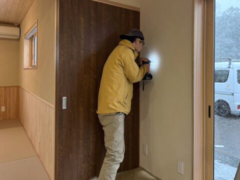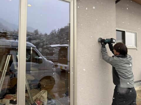 雪の降る寒い日でしたが、工事段階からペレットストーブの設置場所を決定していたこともあり、配管施工などの作業もスムーズに進みました。