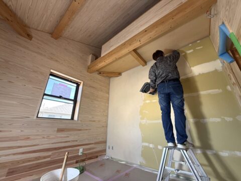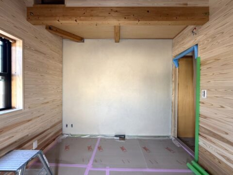 そこで、壁の一面だけは珪藻土仕上げにしてアクセントを。珪藻土は表面に無数の小さな孔(あな)があり、音を吸収しやすい素材です。